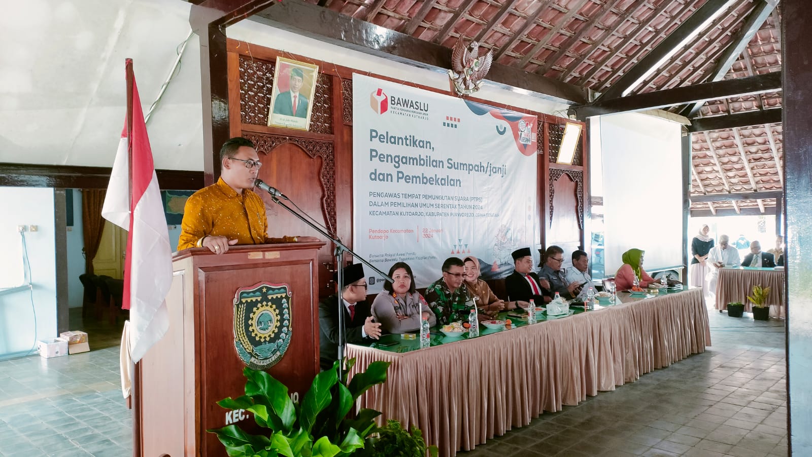 Anggota Bawaslu Provinsi Jawa Tengah Nur Kholiq memberikan sambutan dan arahan pada prosesi pelantikan dan pengambilan sumpah/janji Pengawas TPS di Kecamatan Kutoarjo, Senin (22/1/2024). (Foto: Humas Bawaslu Purworejo)