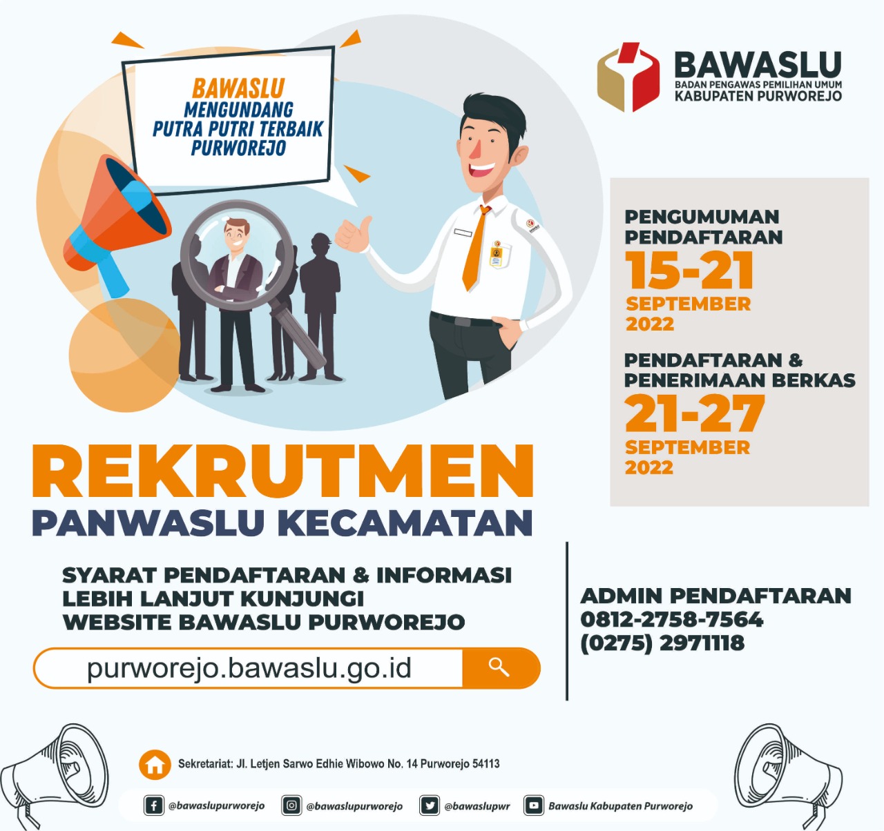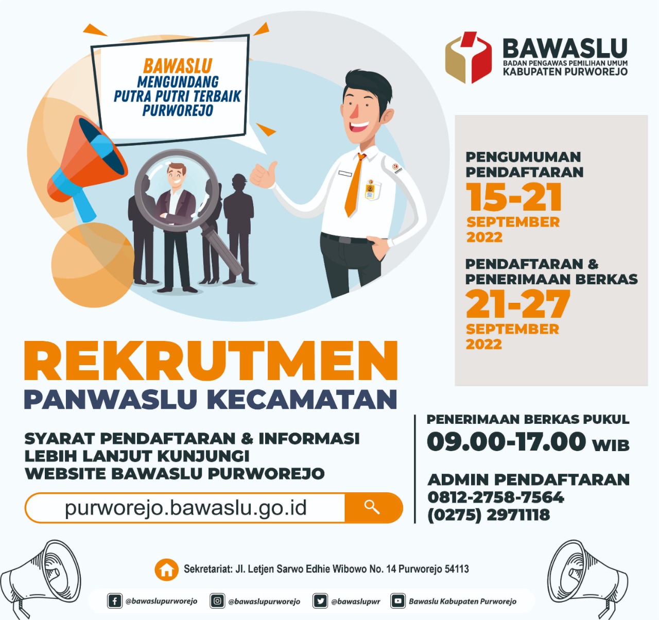 Bawaslu Kabupaten Purworejo memanggil putra-putri terbaik Kabupaten Purworejo untuk mengikuti proses rekruitmen Panwaslu Kecamatan dalam Pemilu Serentak 2024.