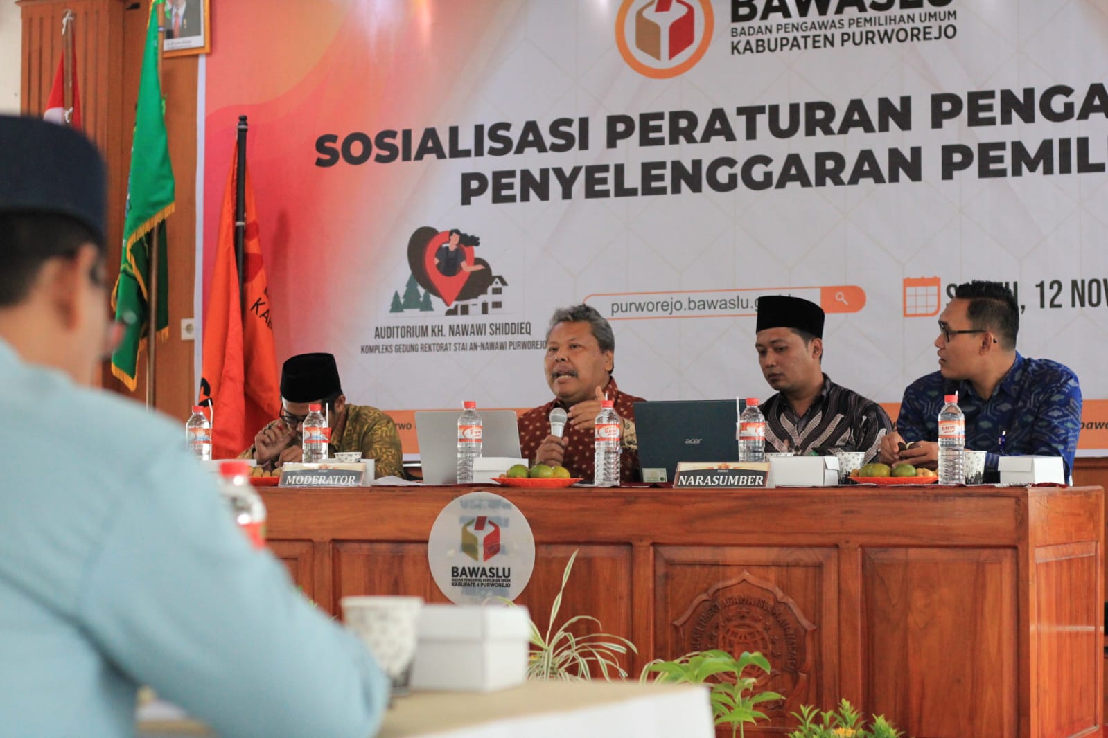 PURWOREJO - Bawaslu Kabupaten Purworejo melaksanakan kegiatan Sosialisasi Peraturan Pengawasan Penyelenggaraan Pemilu 2024 dengan tema Akademisi dan Mahasiswa Sebagai Elemen Strategis Pengawasan Partisipatif pada Pemilu Serentak Tahun 2024. Kegiatan tersebut dilaksanakan di Auditorium KH Nawawi Shiddieq Sekolah Tinggi Agama Islam (STAI) An Nawawi Purworejo, Sabtu (12/11/2022).