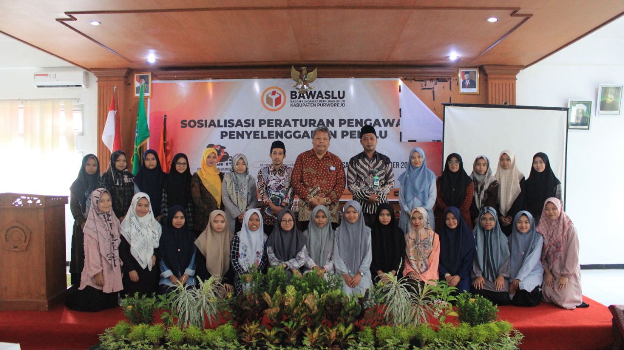 Foto bersama antara anggota Bawaslu Purworejo, narasumber, dan peserta sosialisasi.