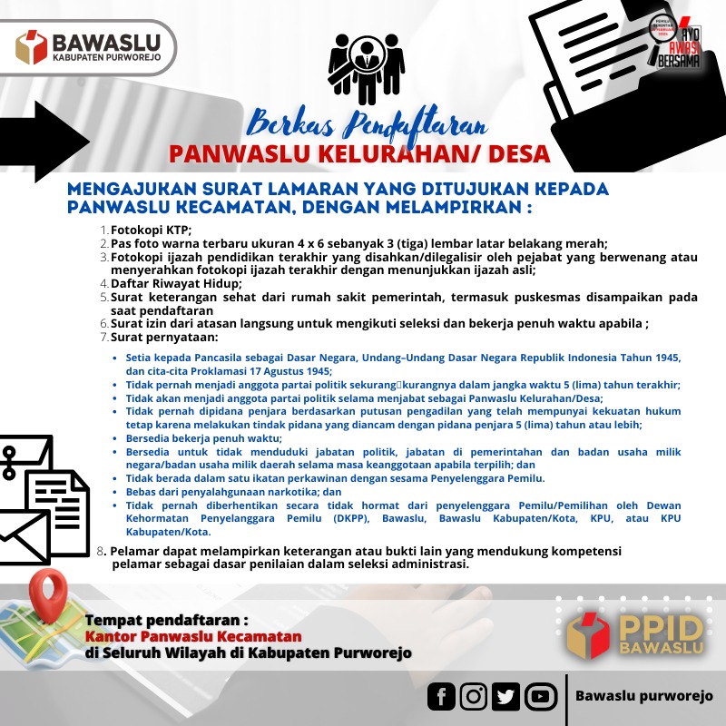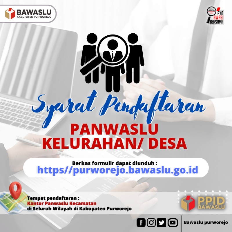 Bawaslu Kabupaten Purworejo memanggil putra-putri terbaik menjadi Panwaslu Kelurahan/Desa untuk mengawal tahapan pemilu 2024. Syarat dan informasi lebih lanjut dapat menghubungi Sekretariat Panwaslu Kecamatan di masing-masing kantor Panwaslu Kecamatan. Silahkan download lampiran berkas pendaftaran Panwaslu Kelurahan/Desa dibawah ini:
