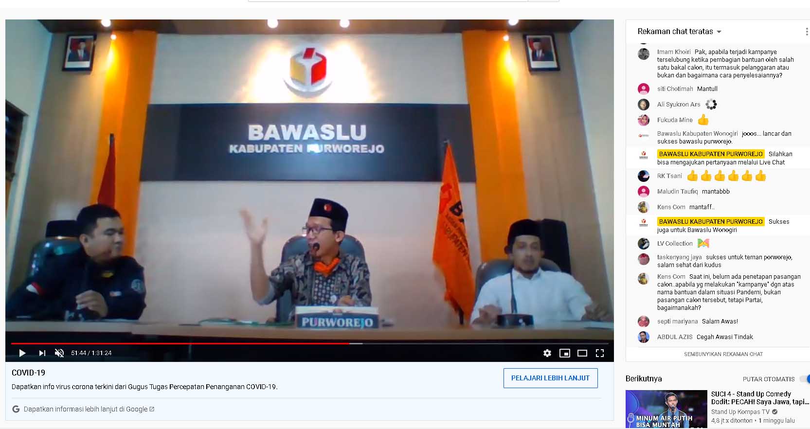 Sama dengan edisi-edisi sebelumnya, webkusi itu digelar di Ruang Sidang Nurhadi. Dua anggota Bawaslu dihadirkan menjadi narasumber. Ali Yafie, Kordiv Penyelesaian Sengketa dan Rinto Hariyadi, Kordiv Hukum Humas dan Hubungan Antar Lembaga. Amri Hidayat, staf divisi penyelesaian sengketa ditugaskan sebagai moderator.