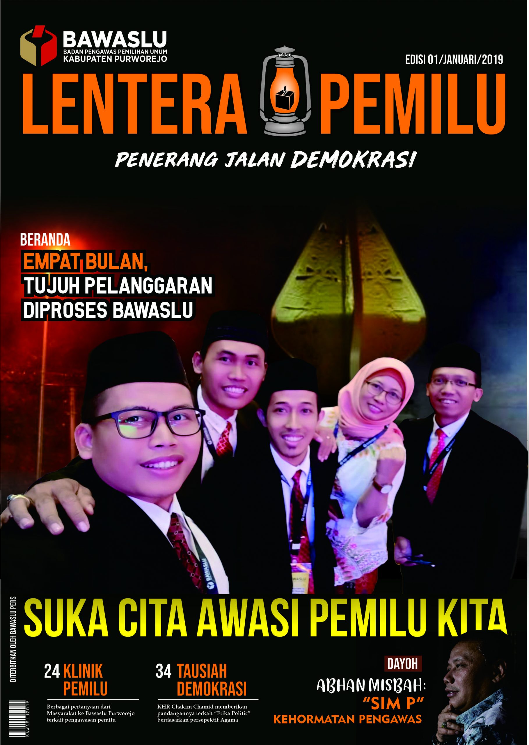 Majalah Lentera Pemilu Edisi 1 mengangkat tajuk "SUKA CITA AWASI PEMILU KITA". Di dalam majalah edisi pertama ini sahabat Bawaslu akan mendapatkan konten yang lumayan lengkap, mulai dari Laporan Pelanggaran, Opini, Klinik Pemilu, Tausiyah Demokrasi hingga konten kekinian semisal Kartun Demokrasi.