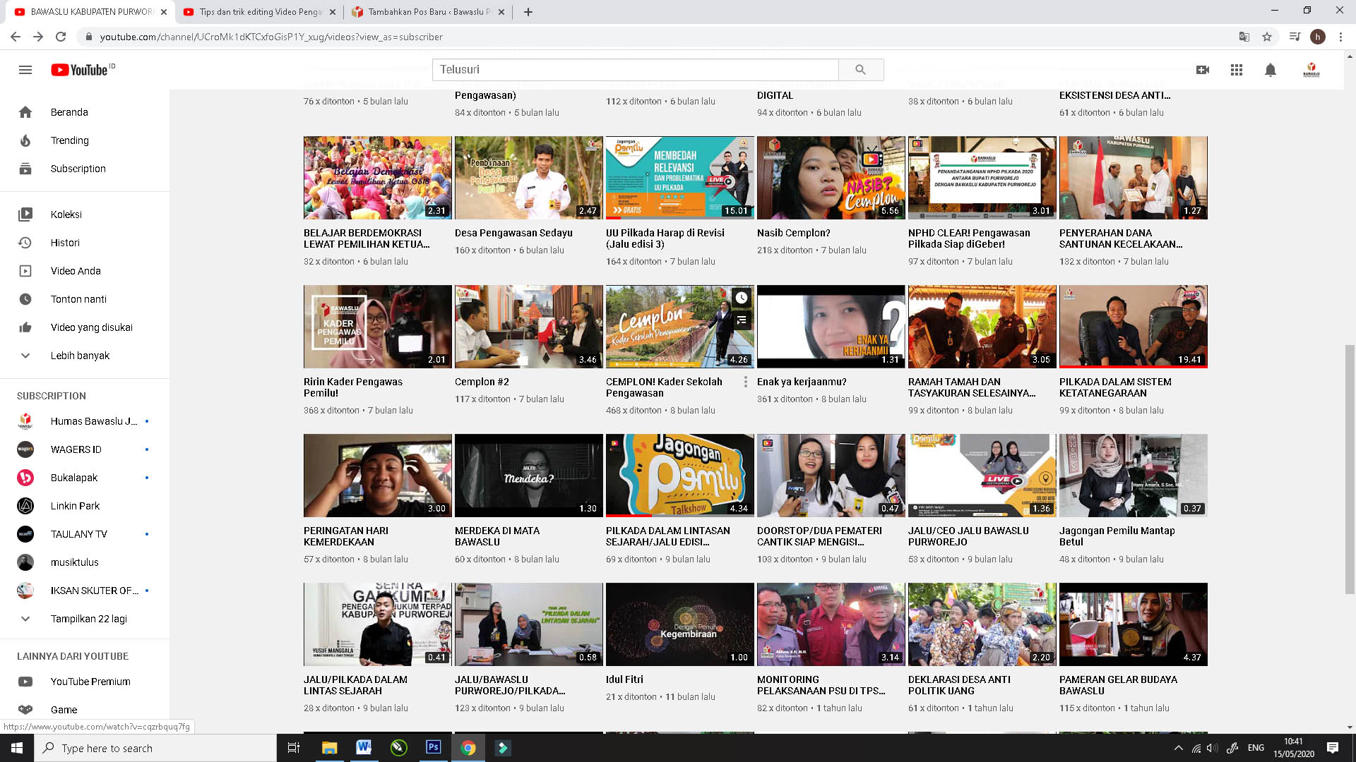 Ada beberapa jenis video yang dibuat diantaranya kegiatan sosialisasi, tutorial, dan edukasi terkait kepemiluan. Video tentang kegiatan sosialisasi pengawasan dengan pedagang pasar di Pasar Krendetan Kecamatan Purworejo dengan judul Grebeg Pasar itu merupakan video pertama yang dibuat sekitar Bulan Maret tahun 2019. Kualitas pengambilan video dan editing masih dibawah rata-rata. Mengingat masih banyak kekurangan.