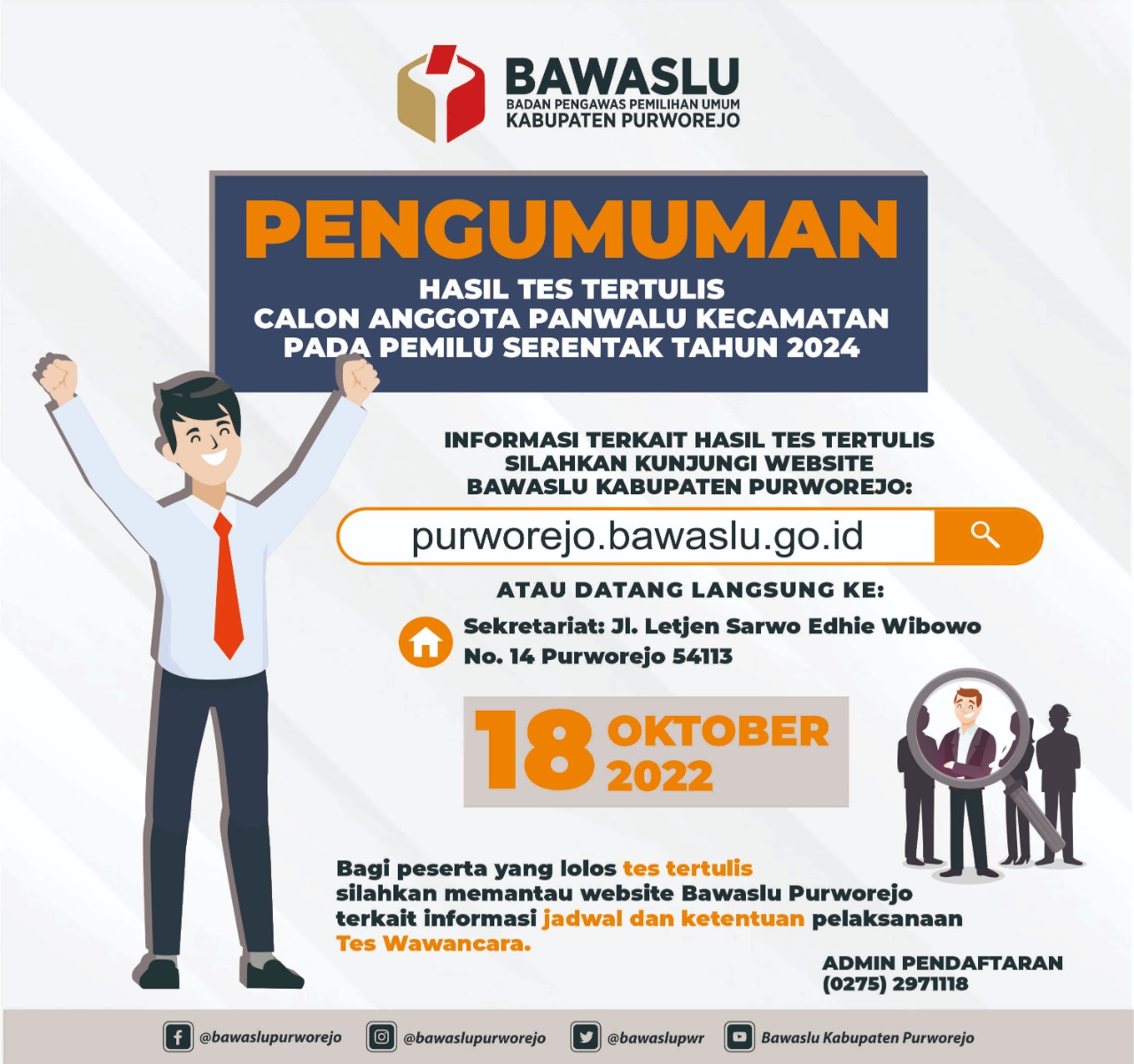 PENGUMUMAN HASIL TES TERTULIS CALON ANGGOTA PANWASLU KECAMATAN UNTUK KABUPATEN PURWOREJO Nomor : 051/KP.01.00/K.JT-21/10/2022