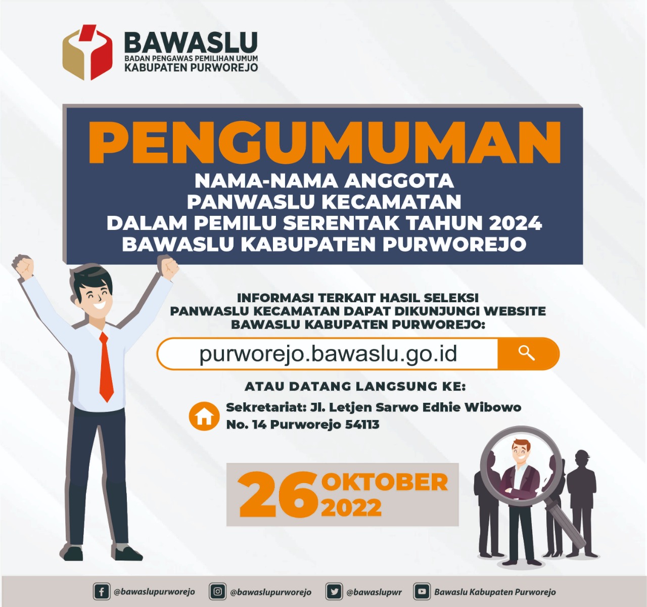 Download PengumumanUntuk mendapatkan informasi lebih lanjut bisa datang langsung ke kantor Bawaslu Kabupaten Purworejo. Google Maps
