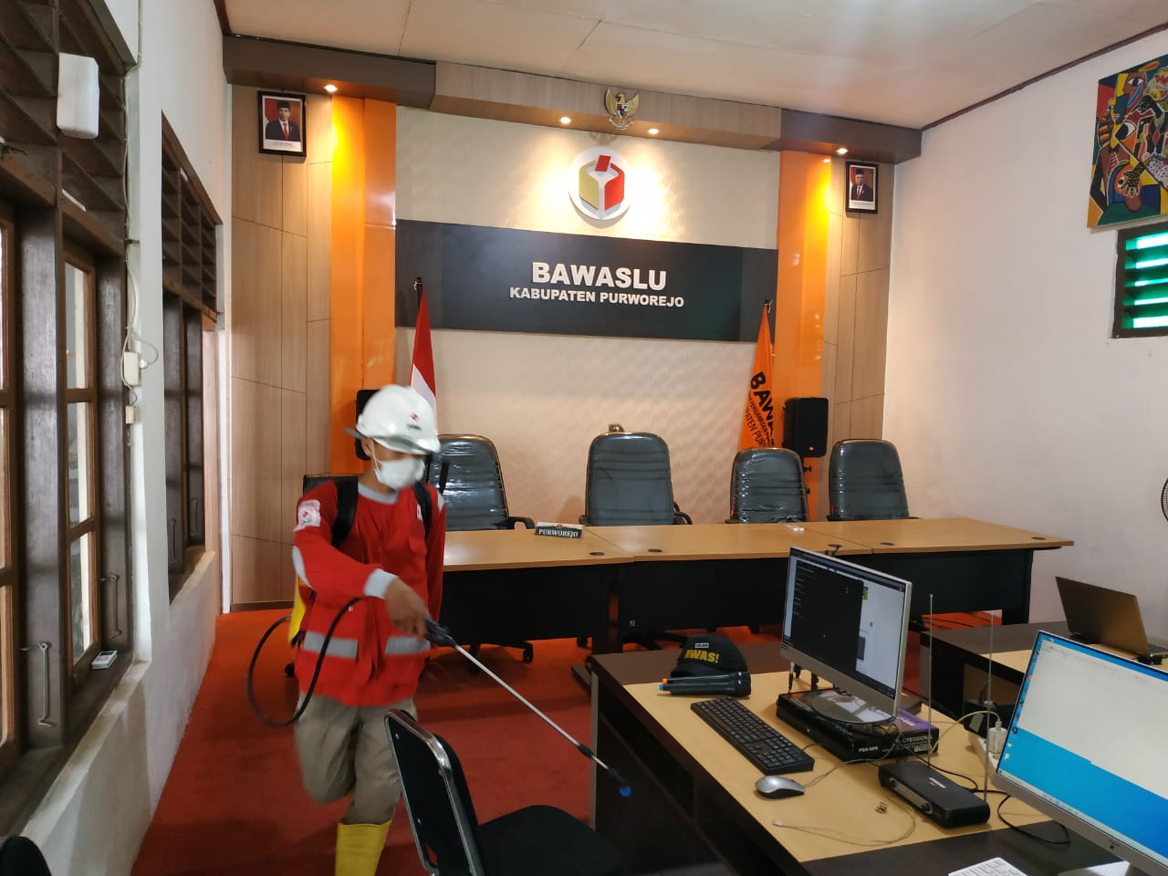 PURWOREJO - Sejumlah personel Palang Merah Indonesia (PMI) Kabupaten Purworejo menyeterilkan Kantor Bawaslu Purworejo. Penyeterilan dilakukan dengan menyemprotkan cairan desinfektan ke seluruh ruangan dan peralatan kantor. Hal ini sebagai upaya pencegahan penyebaran virus Covid-19, Kamis (19/3).