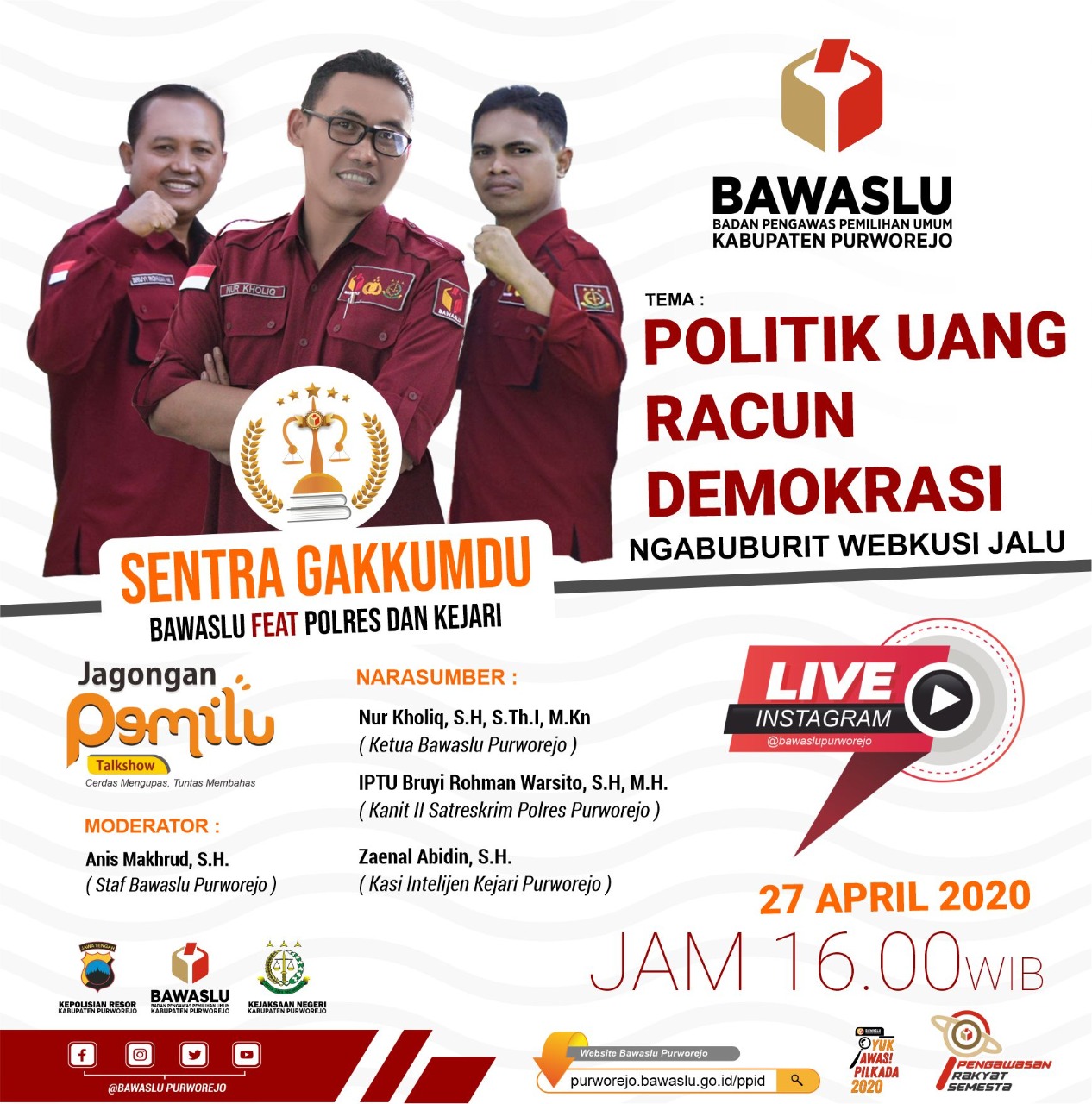 Kasi Intel Kejaksaan Negeri Purworejo yang juga anggota Sentra Gakkumdu Zaenal Abidin SH MH mengingatkan bahwa ancaman pidana politik uang di undang-undang Pilkada jauh lebih berat dibandingkan di undang-undang pemilu. Politik uang saat Pilkada terancam hukuman maksimal 72 bulan dengan denda sampai Rp 200 juta.