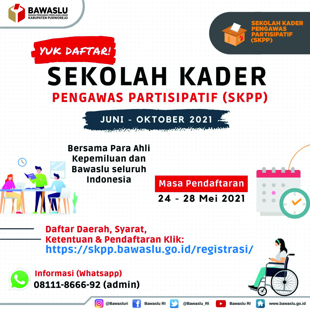Pendaftaran Sekolah Kader Pengawas Partisipatif (SKPP) Tahun 2021 kembali dibuka. Bawaslu RI membuka peluang untuk 304 Kabupaten/Kota di Indonesia. Untuk di Jawa Tengah hanya terdapat 18 Kabupaten/Kota yang membuka pendaftaran SKPP Bawaslu. Yakni Kabupaten Kudus, Demak, Batang, Jepara, Cilacap, Kendal, Sragen, Pati, Blora, Banyumas, Brebes, Magelang, Wonosobo, Purworejo, Rembang, Klaten, Kota Semarang, dan Kota Surakarta.