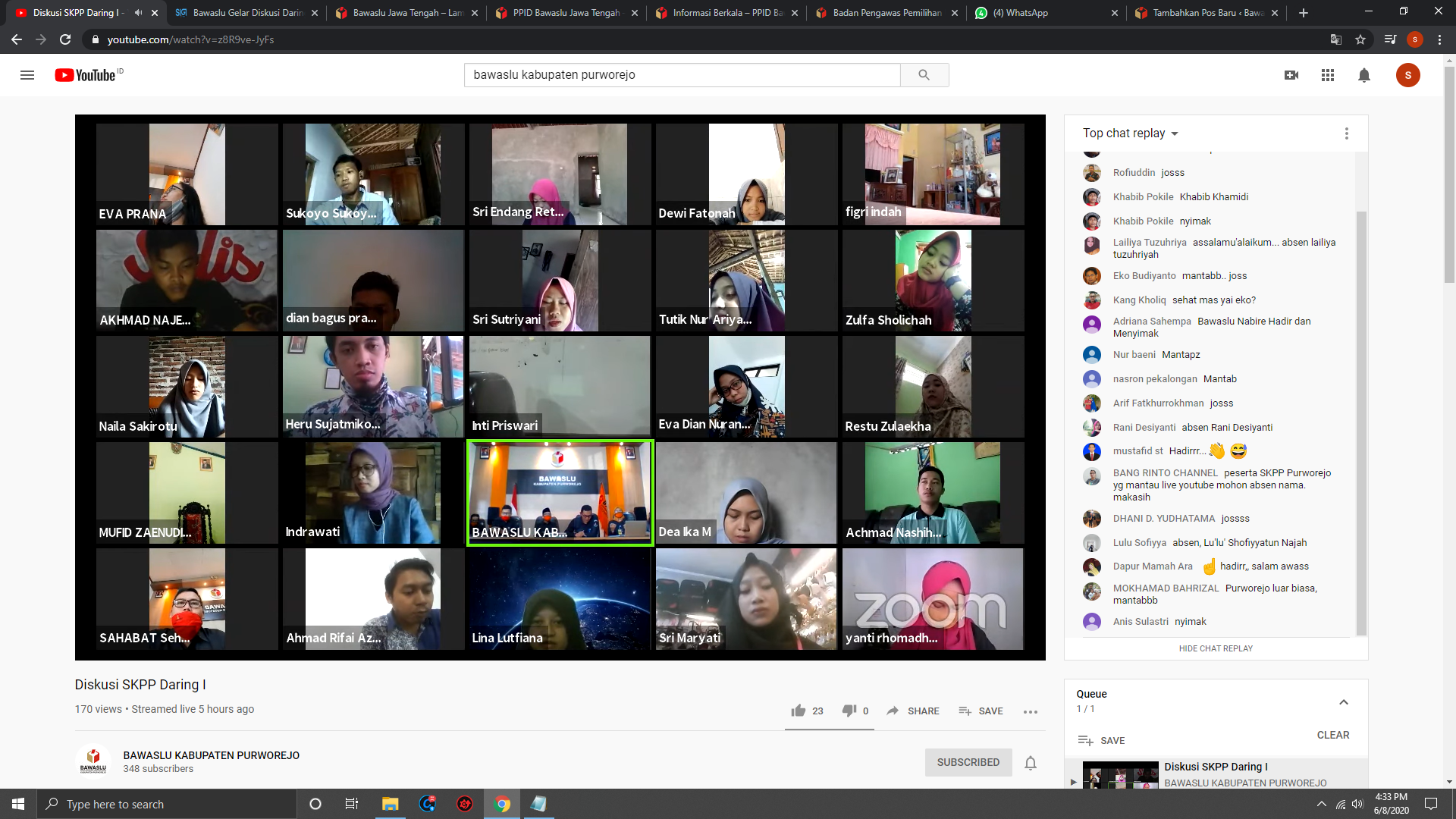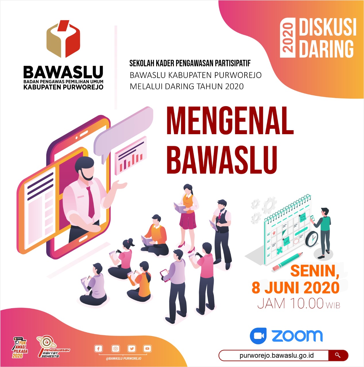 Diskusi daring dengan tema "Mengenal Bawaslu" merupakan tahapan seleksi kader pengawas dari progam SKPP yang diselenggarakan Bawaslu RI sebagai progam untuk meningkatkan partisipasi masyarakat dalam mengawasi pemilu di tengah pandemi Covid-19. Di Kabupaten Purworejo SKPP daring diikuti oleh 33 peserta dari total 40 peserta yang lolos seleksi audio visual.