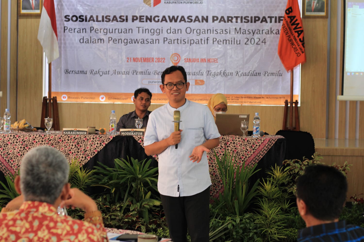 Hal itu disampaikan Koordinator Divisi Pencegahan, Partisipasi Masyarakat, dan Humas Anik Ratnawati pada kegiatan Sosialisasi Pengawasan Partisipatif, pada Kamis (21/11/2022), di Ballroom Hotel Sanjaya Inn Purworejo. Pada tahap kedua Bawaslu Purworejo melanjutkan MoU dengan satu perguruan tinggi yakni STIE Rajawali dan 11 ormas yakni PGRI, PPNI, IBI, PCNU, HMI, PMII, KNPI, IPNU, IPPNU, IDP, serta Pemuda Katolik di Kabupaten Purworejo.