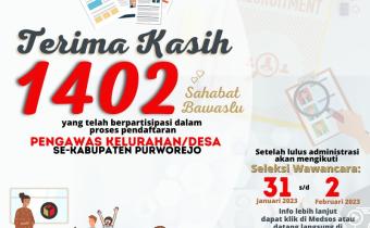 PURWOREJO – Sebanyak 1.402 orang mendaftar Panwaslu Kelurahan/Desa (PKD) di Kabupaten Purworejo. Dari total pendaftar tersebut jumlah laki-laki mencapai 690 orang sedangkan jumlah pendaftaran perempuan mencapai 712 orang.
