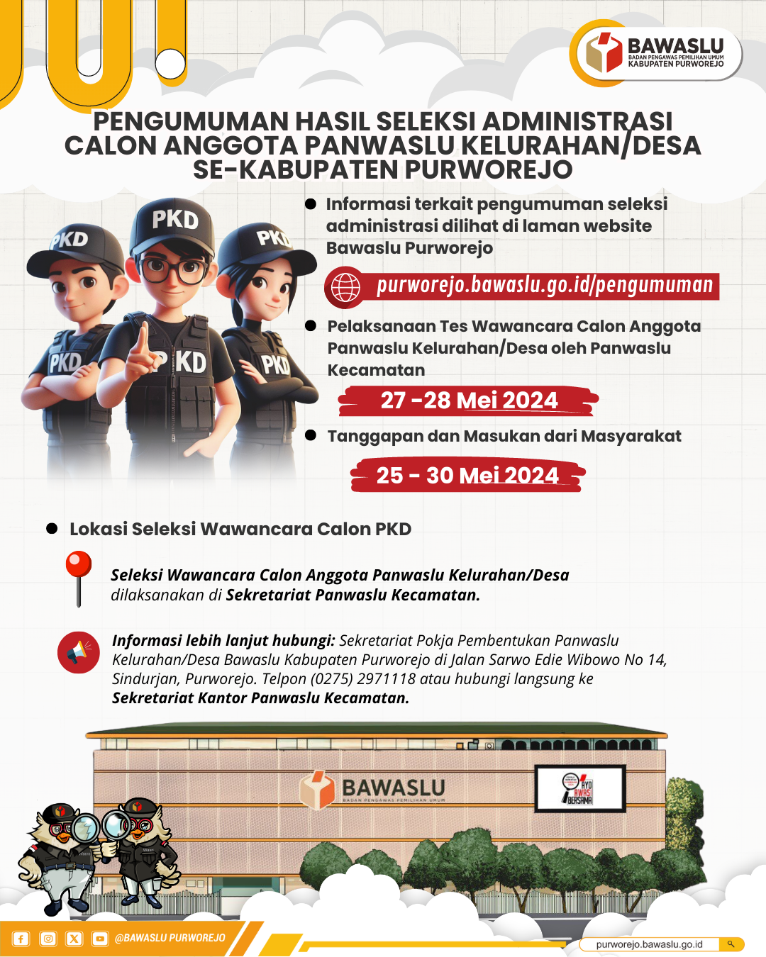 Download pengumuman hasil seleksi calon anggota Panwaslu Kelurahan/Desa Se Kabupaten Purworejo.Download Pengumuman