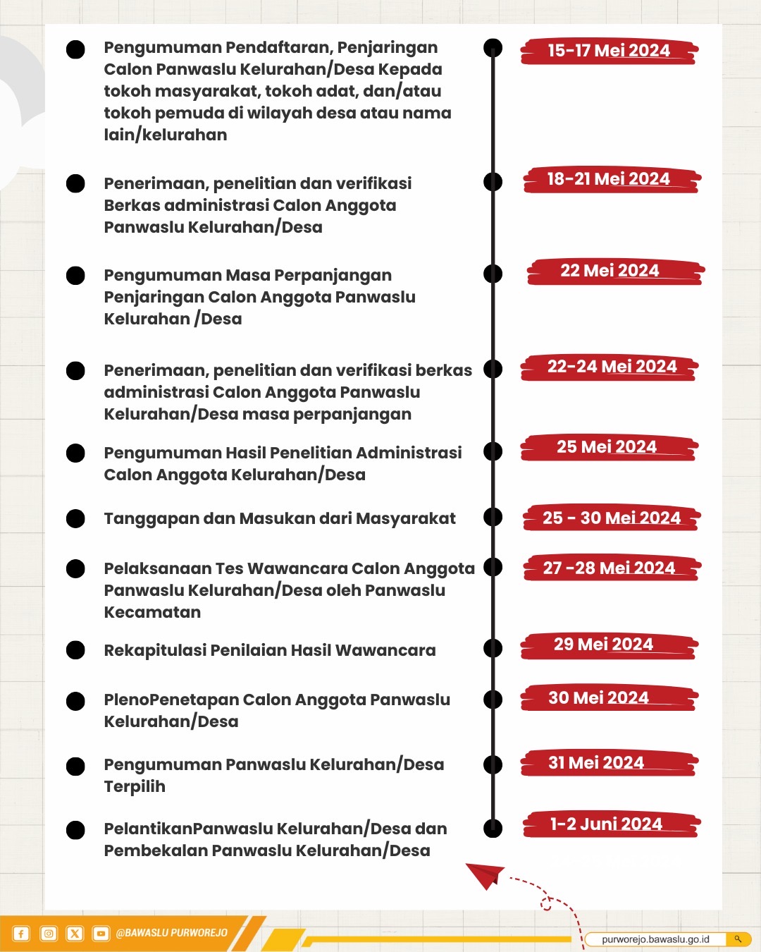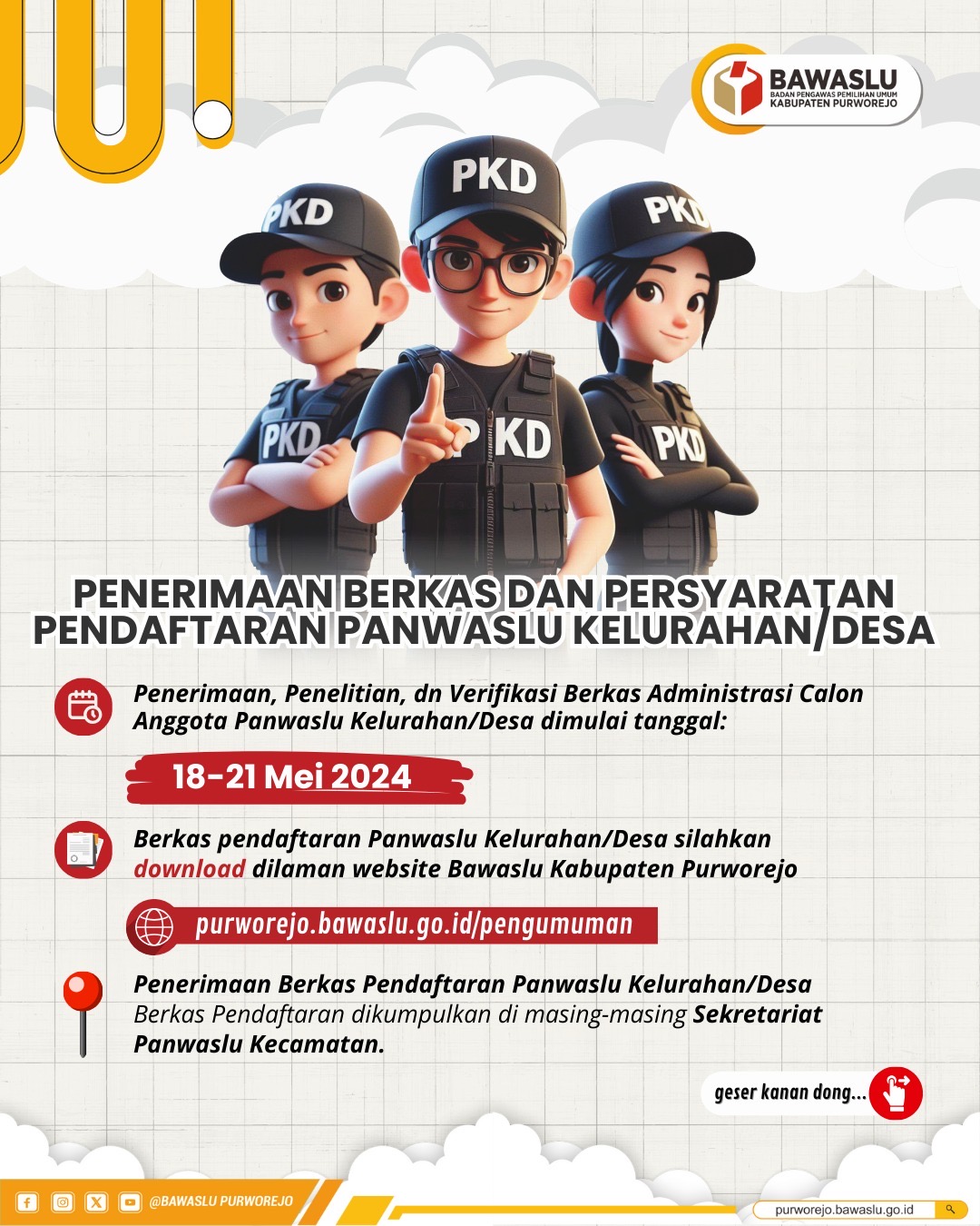 Sahabat Bawaslu, berikut kami sampaikan pengumuman Pendaftaran Panwaslu Kelurahan/Desa di Kabupaten Purworejo. Bawaslu Purworejo memanggil putra putri terbaik di Purworejo untuk bergabung menjadi pengawas pada tahapan penilihan serentak tahun 2024. Silahkan download pengumuman dan lampiran berkas pendaftaran dibawah ini: